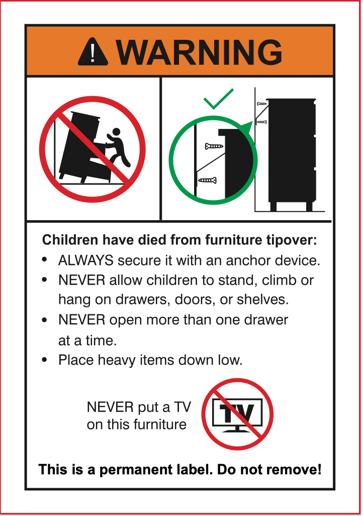 WARNING Children have died from furniture toppling over. • ALWAYS secure this furniture with an anchor device. • NEVER allow children to stand, climb or hang on drawers, doors, or shelves. • NEVER open more than one drawer at a time. • Place heavy times down low. NEVER place a TV on this furniture. This furniture is at high risk of toppling over. For more information, visit https://www.productsafety.gov.au