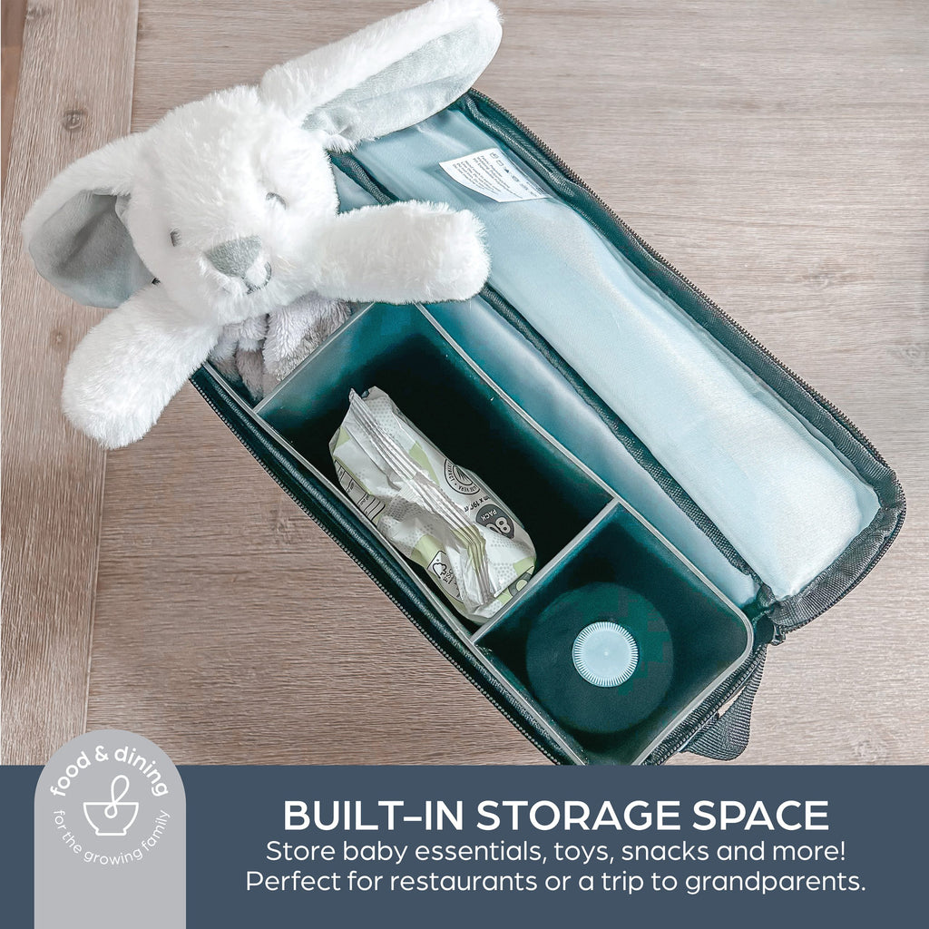 - Handy storage compartment – perfect for baby bottles, nappies, wipes, food pouches, and much more!