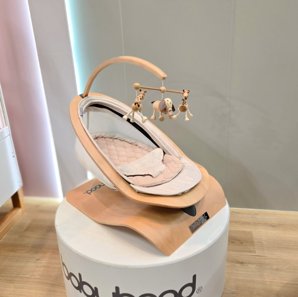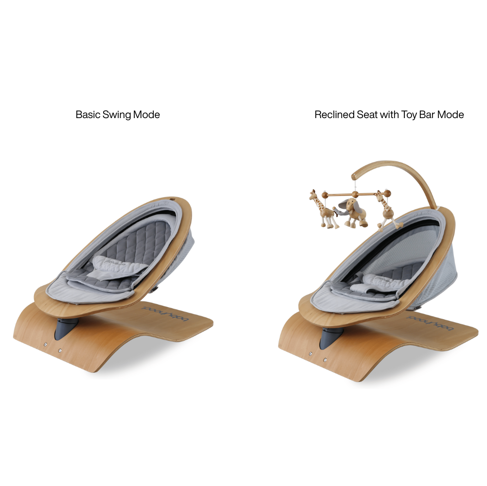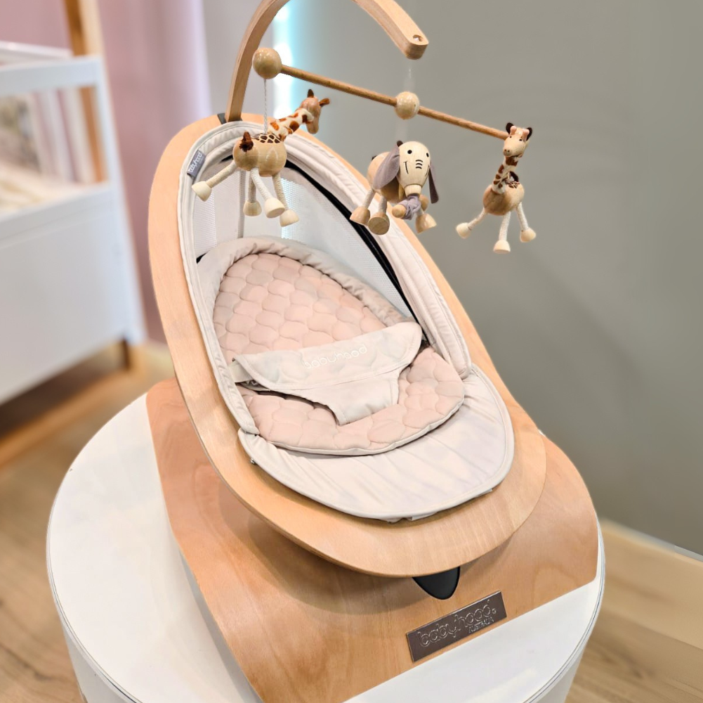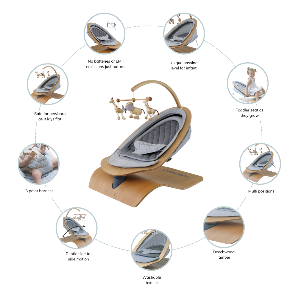 A beautifully crafted European beechwood timber swing which sways gently from side to side, to mimic the way in which you gently rock your baby from side to side, for hours of playtime or dreamy time with mum.