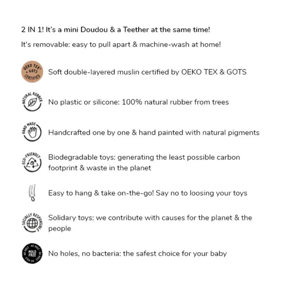 2 IN 1! It’s a mini Doudou & a Teether at the same time! This baby doudou is made with a soft double-layered muslin. The best part: it’s removable! Completely easy to pull apart & machine-wash at home!