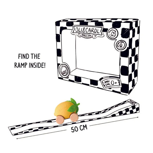 Introducing Lou, the sustainable baby car toy! A lemon-inspired design handcrafted with natural rubber & FSC wood. This baby car promotes interactive play, cognitive development and social skills. It’s packaging has a drop-down ramp inside making it reusable & fun to play with!