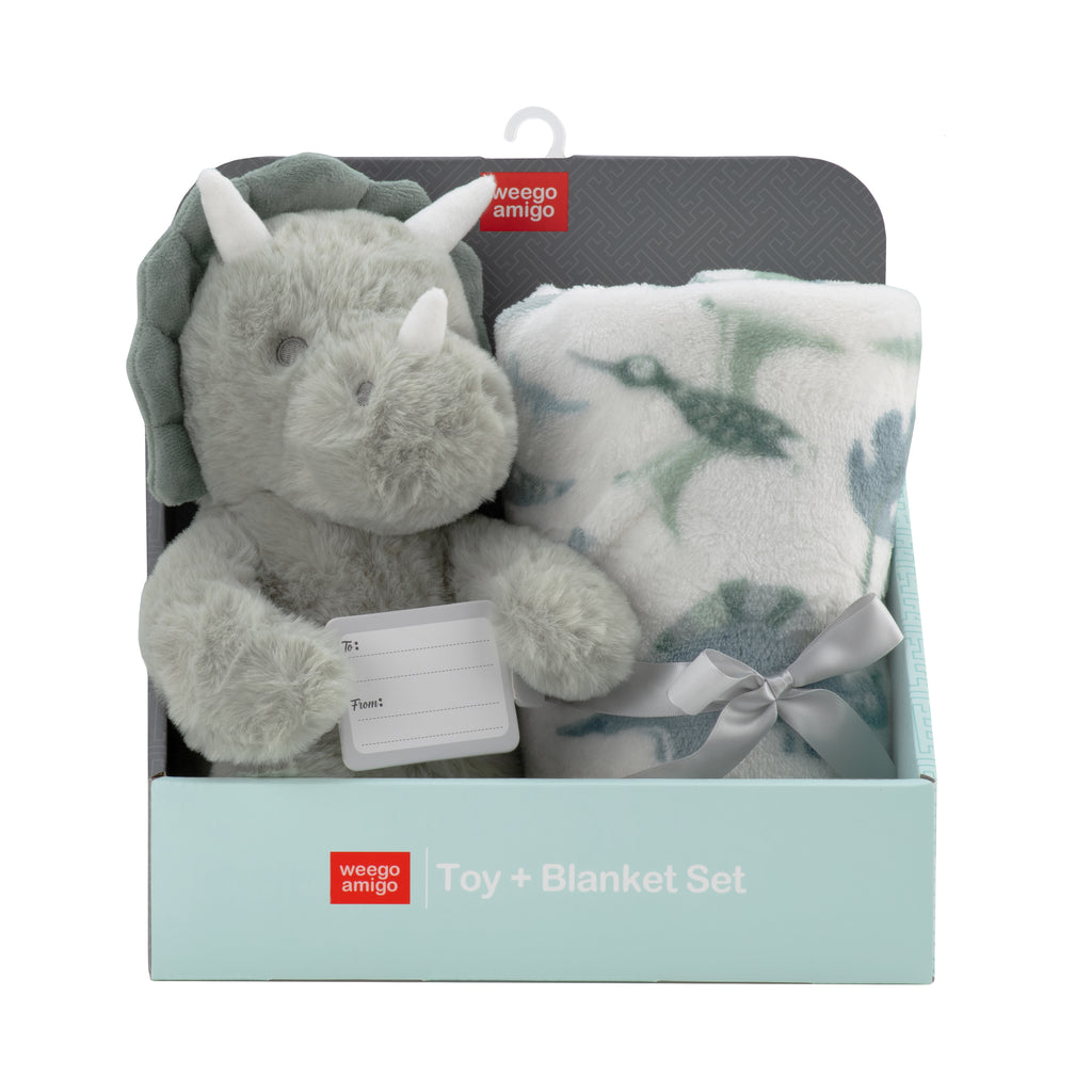33cm plush fur Triceratops toy with a coordinating 100 x 75cm durable plush dino-themed blanket. He is a bunch of soft Cretaceous Period fun. Definitely not a fossil.